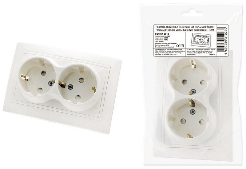 TDM Таймыр Белый Розетка 2-местная 2П+З с защитными шторками 16А 250В (пром. упаковка, бакелит. основание) SQ1814-0518 представляет собой надежное и безопасное решение для подключения электрооборудования в различных помещениях.