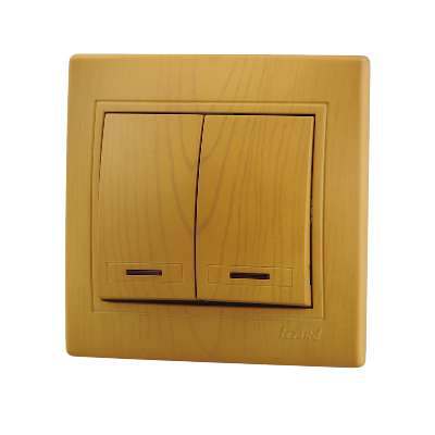 Выключатель двойной с подсветкой. Изделия с расцветкой «под дерево» изготовлены из покрашенного «под фактуру» пластика, а не оклеены цветной пленкой. Безопасные для рук крепежные выступы с пружиной и возвратом в исходное положение. Серебряные контакты, в