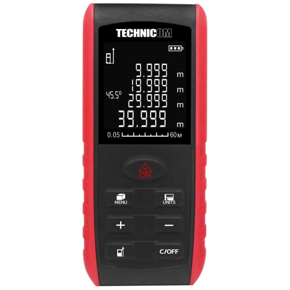 Лазерный дальномер-угломер TECHNICOM TC-DAM60R – это прибор, который измеряет расстояние до объекта посредством лазерного луча. Дальность измерений составляет 60 метров. Данный дальномер производит измерения длины, ширины, высоты, площади, объема, выполняет специфические измерения, так называемая функция Пифагора. Для удобства выполнения измерений в дальномере предусмотрены 2 точки отсчета и встроенный угломер. Прибор имеет четырехстрочный информативный дисплей со встроенной подсветкой. Работает от батареек, которые входят в комплект. Длительность применения порядка 8000 измерений с одного заряда. Функция сохранения данных в памяти позволяет сохранить до 99 измерений.