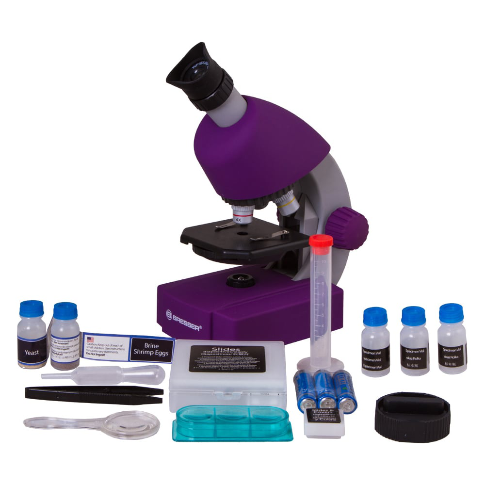 Микроскоп Bresser Junior 40x-640x, фиолетовый 70121 создан специально для юных исследователей микромира. Он имеет простую и надежную конструкцию и комплектуется набором для проведения опытов. Микроскопом легко управлять, и вам не придется долго объяснять ребенку, как им пользоваться. В конструкции нет опасных съемных частей, поэтому вы сможете оставить ребенка с микроскопом наедине. Оптическая система микроскопа состоит из двухпозиционного окуляра, рассчитанного на два увеличения, и револьверного устройства с тремя объективами разной кратности. В совокупности образцы можно рассматривать при увеличении от 40 до 640 крат. Для смены кратности необходимо или повернуть диск с объективами, или вывернуть окуляр. Предметный столик микроскопа снабжен металлическими зажимами для удержания микропрепаратов. Под столиком расположен диск с диафрагмами – прямо как во «взрослом» микроскопе. С его помощью можно регулировать степень освещенности образца.