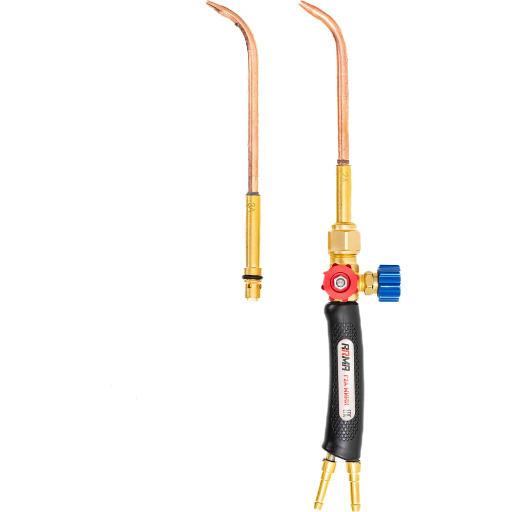 Инжекторная горелка для сварки металлов толщиной до 4 мм. Укомплектована латунными сварочными наконечниками с медными мундштуками № 2А (1,0–2,0 мм)) и 3А (2,0–4,0 мм)Горелка ацетиленовая Г2А МИНИ (№ 2А, 3А) предназначена для сварки, пайки высокотемпературными припоями, нагрева, плавления и прочих видов газопламенной обработки металлов. На горелках установлена ручка из высокотемпературного штампованного пластика, выдерживающая температуру до 200°С, благодаря чему можно работать в тонких рукавицах.Горелка укомплектована медными цельнотянутыми наконечниками, которые позволяют выполнять работы в ограниченном пространстве и в труднодоступных местах. Точная регулировка мощности пламени в пределах одного наконечника производится вентилями, ступенчатое изменение — сменой наконечников.Особенности горелки ацетиленовой Г2А МИНИ (№ 2А, 3А):Горелка обладает компактными размерами и облегченной конструкцией.Материал наконечников - медная цельнотянутая трубка. Это обеспечивает большую продолжительность работы без перегрева за счет улучшенного теплоотвода.Конструктивная особенность коротких загнутых «носиков» в каждом наконечнике позволяет производить сварочные работы в очень стесненных условиях, производить угловые швы.Горелка укомплектована ниппелями, что позволяет использовать резинотканевые рукава с внутренним диаметром 6 мм без дополнительных переходников, и накидными гайками M12х1,25 для подачи кислорода и M12х1,25LH для подачи ацетилена.