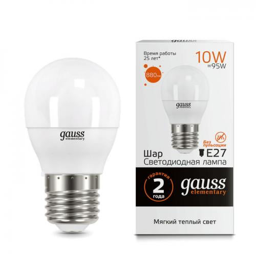 Gauss Elementary Лампа LED Globe, 10W, E27, 2700K Класс энергоэффективностиA+