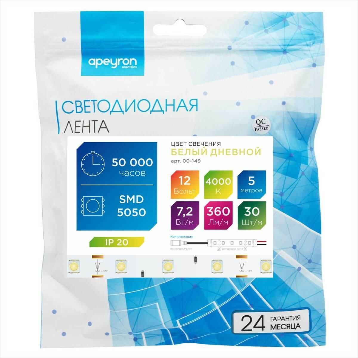 Расширенная гарантия на товар составляет 2 года. поставщик рекомендует использовать лампы накаливания с цоколем не указан для освещения площади не указана м2. Светодиодная лента Apeyron 7,2W/m 30Led/m 5050SMD дневной белый 5M 00-149 в современном стиле используется в интерьере не указан с установкой не указано.