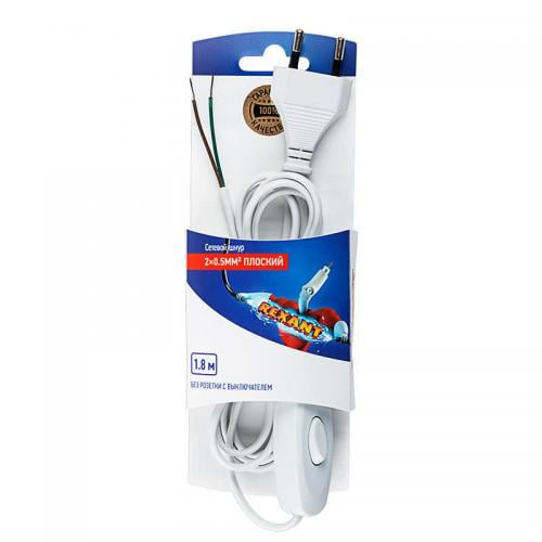Rexant 06-3251Шнур сетевой 1.8М с выключателем без розетки 2.5A-220V белый REXANT предназначен для подключения к сети переменного тока (AC) с напряжением 220B электроприборов напрямую (скруткой или клеммным соединителем), без использования розетки. Данный шнур состоит из двухжильного провода, с одной стороны литой неразборной плоской вилки (Евро), с другой подготовленных (зачищенных и облуженных оловом) проводников и расположенного посередине провода пластикового выключателя. Основные характеристики: